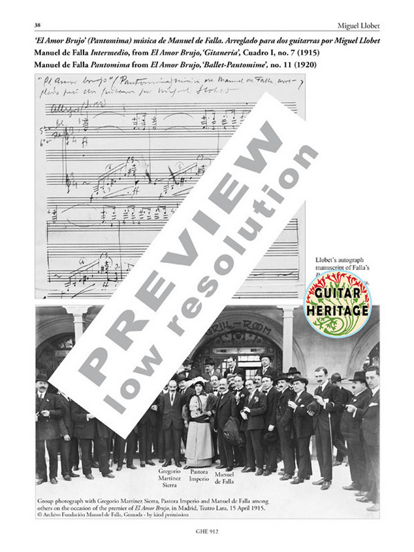 The definitive new Llobet Edition in 16 Volumes Grondona, Stefano, ed Manuel de Falla FALLA: Cubana Danza del Molinero Pantomima Danza ritual del Fuego The complete repertoire of music for the famous Anido-Llobet guitar duo consists of 1 original work by Eduardo Torres and 22 arrangements by Llobet specifically for the duo. Out of that total of 23 works, 8 are going to be published for the first time and are marked with an asterisk* = 1st publication Note: These 4 works by Manuel de Falla in this duo album are recorded on the CD which comes with volume 8 of the present edition (Manuel de Falla, a Tryptich, book+CD package, Volume 8 of Llobet's Guitar Works - Homenaje - Canción del Fuego Fatuo - Romance del Pescador) order no. GHE708BCD.