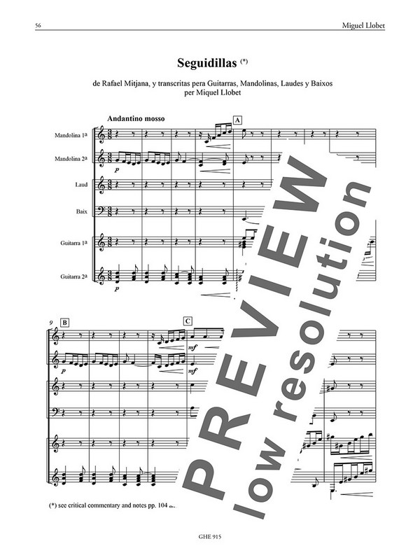 The definitive new Llobet Edition in 16 Volumes Grondona, Stefano, ed Miguel Llobet (arr) -Cançons Populars Catalanes 1. La filla del marxant (solo mand, mand 1, mand 2, Laud, gtr 1, gtr 2) 2. LAnunciació (solo mand, mand 1, mand 2, lauds, gtr 1, gtr 2) 3. Lhostal de la Peyra (mand 1, mand 2 lauds, archi-laud, solo gtr, gtr 1, gtr 2) Miguel Llobets arrangements from the classical tradition 4. Mozart: Minuet de Don Joan (mand 1, mand 2, lute, 2 gtrs, archi-laud) 5. Mozart: Serenata de Don Joan (mand 1, mand 2, laud/archi-laud/gtr 1, gtr 2) 6. Beethoven: Minuet (mand 1, mand 2, laud, gtr) 7. Beethoven: Scherzo de la Sonata 3 (mand 1, mand 2, laud, archi-laud) 8. Mendelssohn: Romansa (mandolin, archilaud, gtr) 9. Mendelssohn: Romanza sin palabras (mand 1, mand 2, laud, archi-laud, guitar) 10. Chopin: Preludi (mand, guitar 1, guitar 2) 11. Schumann: Coral (mand 1, mand 2, mand 3, laud) 12. Schumann: Romansa sense paraules (mand 1, mand 2, laud, archi-laud, gtr 1, gtr 2) Miguel Llobets arrangements from Iberian impressionism 13. Rafael Mitjana: Seguidillas (mand 1, mand 2, laud, baix, gtr 1, gtr 2) 14. Isaac Albéniz: Granada (mand-G 1, mand-G 2, laud, archilaud, gtr 1, gtr 2) An original composition for Lira Orfeo 15. Manuel Burgés: Triomphe dOrphée (mand-esp 1, mand-esp 2, tenor luths, basse archi-laud, gtr 1, gtr 2)