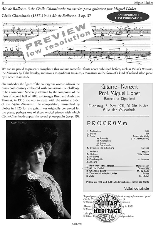 The definitive new Llobet Edition in 16 Volumes Grondona, Stefano, ed Spain to Mitteleuropa VILLAR: Berceuse (canción leonesa) VILLAR: Danza Española VALVERDE: Clavelitos BIZET: La Arlesiana CHAMINADE: Aire de Ballet No. 3 (1925)* RUBINSTEIN: Romanza TCHAIKOVSKY: Mazurka op. 40 no. 5* GRIEG: Melodia Noruega from op. 24 BUFALETTI: Mazurka (1918)