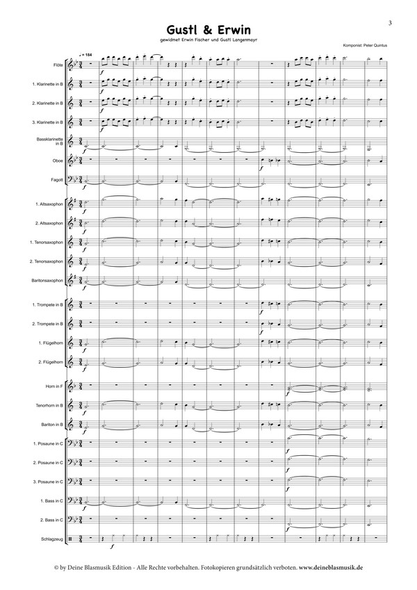 Walzer Leider ist der Walzer nicht unbedingt als des Blasmusikers "Liebling" bekannt. Dabei steckt im Walzer soviel Musik! Zwei besonderen Fans dieses Genres widmete Peter Quintus diese Komposition. Die beiden Klarinettisten "Gustl & Erwin" haben es immer wieder verstanden, mit ihrer großen Hartnäckigkeit den Dirigenten ihres Orchesters zu animieren, einen Walzer aufzulegen. Entstanden ist ein abwechslungsreiches Werk, das gute Laune pur verbreitet. Die eingängige Melodie der Tenor- und Flügelhörner zieht sich durch das gesamte Stück, garniert mit verblüffenden und überraschenden Effekten im Rhythmus sowie einem Trio, in dem auch mal Klarinetten- und Posaunen-Register solistisch zur Geltung kommen. Wer mag, darf auch gerne mitschunkeln!