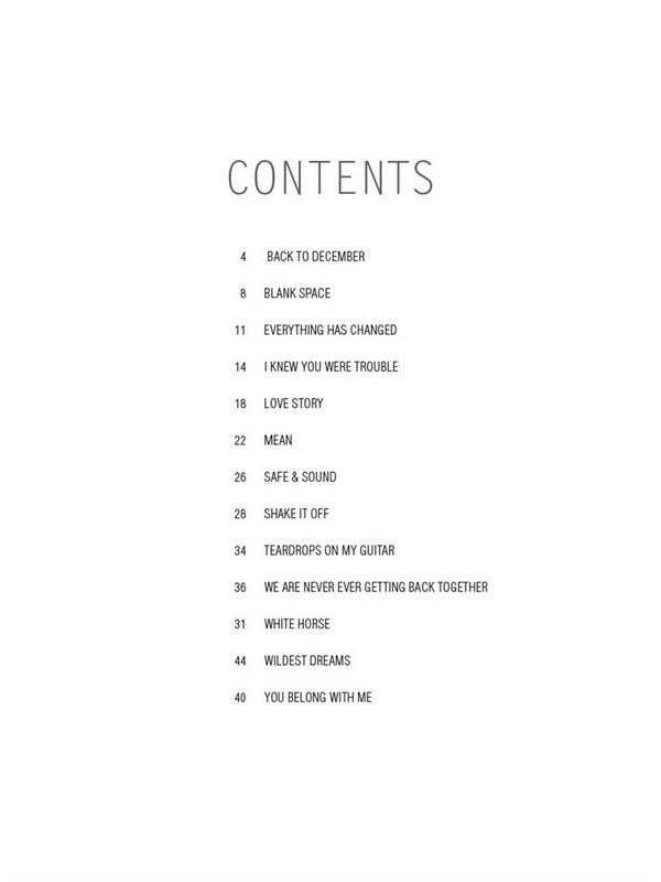 A baker's dozen of Taylor's finest presented with lyrics, chord symbols and guitar chord frames. Includes: Back to December · Blank Space · Everything Has Changed · I Knew You Were Trouble · Love Story · Mean · Safe & Sound · Shake It Off · Teardrops on My Guitar · We Are Never Ever Getting Back Together · White Horse · Wildest Dreams · You Belong with Me. 1. Shake It Off 2. Teardrops On My Guitar 3. Love story 4. You Belong With Me 5. White horse 6. Mean 7. Back to December 8. Safe & Sound 9. We Are Never Ever Getting Back Together 10. Everything Has Changed 11. I Knew You Were Trouble 12. Blank Space 13. Wildest Dreams