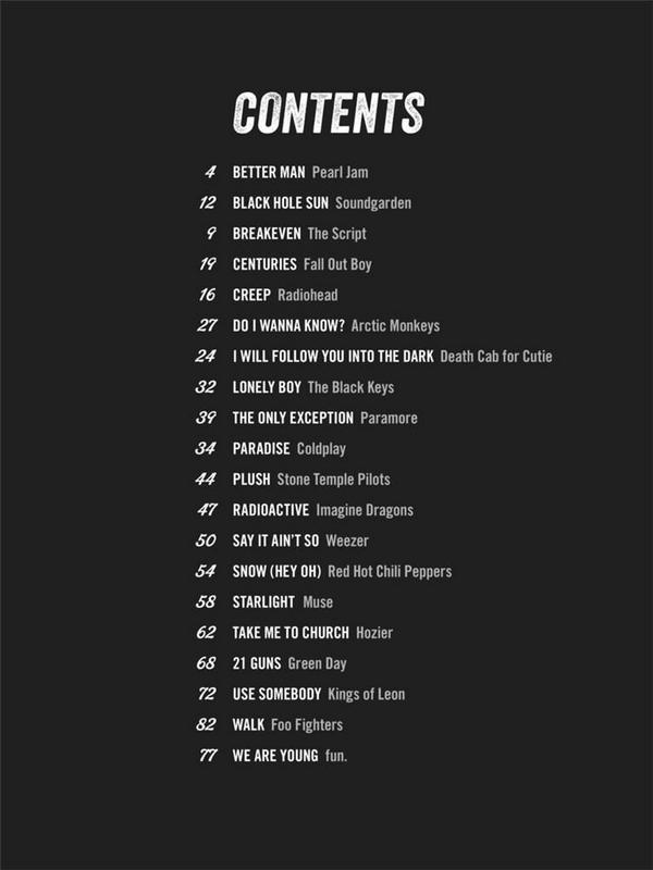 20 Hits Better Man Black Hole Sun Breakeven Centuries Creep Do I Wanna Know? I Will Follow You Into The Dark Lonely Boy The Only Exception Paradise Plush Radioactive Say It Ain't So Snow (Hey Oh) Starlight Take Me To Church 21 Guns Use Somebody Walk We Are Young