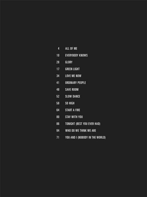 All of me Everybody knows Glory Green Light Love me now Ordinary People Save Room Slow Dance So high Start a Fire Stay with You Tonight (Best You've ever had) Who do we think we are You and I (Nobody in the World)