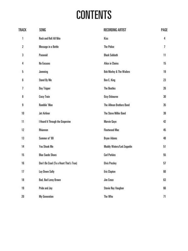 Bad bad leroy brown Blue suede shoes Crazy train Day tripper Don't be cruel I heard it through the grapevine Jamming Jet airliner Lay down sally Message in a bottle My generation No excuses Paranoid Pride and joy Ramblin' man Rhiannon Rock and roll all nite Stand by me Summer of '69 You shook me