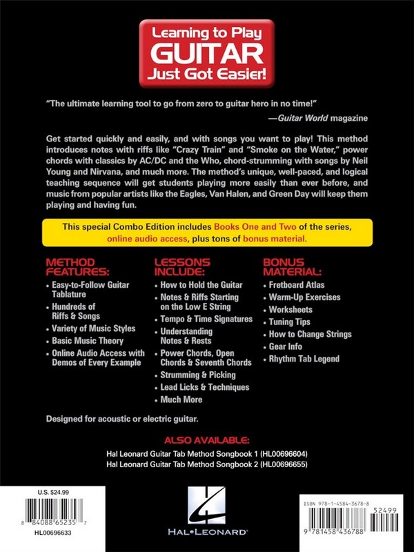 The Hal Leonard Guitar Tab Method series is the first and only beginning guitar method of its kind! This special Combo Edition includes Books 1 and 2 of the series, two audio CDs, plus tons of bonus material! Perfect for both acoustic and electric players. This is the guitar method students and teachers have been waiting for. Learn single notes with riffs like Day Tripper and Crazy Train , power chords with classics by AC/DC and the Who , strumming with songs from Neil Young and Nirvana , and much more. The method's unique, well-paced, and logical teaching sequence will get students playing more easily than ever before, and music from popular artists like The Beatles , Jimi Hendrix and Led Zeppelin will keep them playing and having fun. Jesu, Joy Of Man's Desiring American Woman About A Girl Addams Family Theme Learning To Fly Come Out And Play (Keep 'Em Separated) Joy To The World Get Ready Take Me To The River Don't Fear The Reaper My Name Is Jonas Changes All Along The Watchtower I Don't Know MalagueñA All I Wanna Do Electric Funeral Space Truckin' Smoke On The Water Pride And Joy Hava Nagila (Let's Be Happy) James Bond Theme Knockin' On Heaven's Door Brain Stew (The Godzilla Remix) La Grange Super Freak Lean On Me Smooth Ain't No Sunshine Rock Lobster Hallelujah Aqualung The Joker Hold The Line Don't Stop Believin' Boom Boom Baba O'Riley Wild Thing Seven Nation Army He's A Pirate Machine Gun Bang A Gong (Get It On) The Boys Are Back In Town Barracuda Batman Theme The House Of The Rising Sun Birthday Theme From King Of The Hill Brain Damage Patience La Bamba In My Life Bye Bye Love Can't Buy Me Love Canon In D Elderly Woman Behind The Counter In A Small Town Chicago Blues Feel The Beat T.N.T. Come As You Are Crazy Train Day Tripper Detroit Rock City Do-Re-Mi I'm Shipping Up To Boston My Best Friend's Girl Duelin' Banjos Everybody Hurts Heart Of Gold Bluegrass Run Blues Riff Cool Groove D-Mented Jack Hammer Mega-Heavy Metallic Zeppelin Tribute Misirlou Brit Rock Spanish Bolero Five Foot Two, Eyes Of Blue (Has Anybody Seen My Girl?) Fly Like An Eagle Foxey Lady Free Bird Fur Elise, Woo 59 Get Up Stand Up Goodbye To Romance Green Onions Green-Eyed Lady Hawaii Five-O Theme Hello, Goodbye Helter Skelter Hey Joe I Can't Explain I Hate Myself For Loving You I Saw Her Standing There Iron Man Jailbreak Theme From 'Jaws' Jessie's Girl Lady Madonna Land Of A Thousand Dances Life In The Fast Lane Louie, Louie Love Me Tender Lucy In The Sky With Diamonds Mama, I'm Coming Home The Man Who Sold The World Money (That's What I Want) The Munsters Theme My Sharona Norwegian Wood (This Bird Has Flown) Oh, Pretty Woman Owner Of A Lonely Heart Paperback Writer Peter Gunn The Pink Panther Pipeline Purple Haze Rebel, Rebel R.O.C.K. In The U.S.A. (A Salute To 60's Rock) Runnin' Down A Dream Sgt. Pepper's Lonely Hearts Club Band Should I Stay Or Should I Go Sleepwalk (Instrumental Version) Smells Like Teen Spirit Space Oddity Still Got The Blues Sunday Bloody Sunday Sunshine Of Your Love Susie-Q Sweet Leaf Talk Dirty To Me Taxman That'll Be The Day The Thrill Is Gone Ticket To Ride Tin Pan Alley The Trooper 25 Or 6 To 4 Twist And Shout Walk Don't Run Wild Night Wipe Out Wonderful Tonight Jamie's Cryin' Feel Your Love Tonight Am I Evil? Evil Ways Working Man Yellow Submarine Mississippi Queen Cult Of Personality South Of Heaven Refugee Plush Bring It On Home You Give Love A Bad Name You Really Got Me You Shook Me Like A Rolling Stone Rock You Like A Hurricane Up Around The Bend Wherever I May Roam