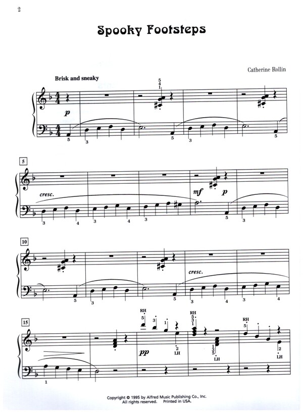 10 original Piano Solos by Alfred and Myklas Composers Late Elementary to Early Intermediate Creepy Footsteps Grumpy Old Witch Halloween Dance Halloween Hoedown Halloween Night It's a Scary Night! Mountain Ghost Town Skeleton Dance! Spooky Footsteps Witches' Brew