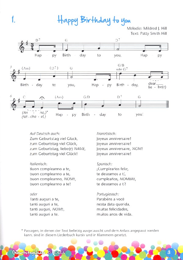 33 musikalische Glückwünsche Reihe Anlässlich ... Band 1 Themenbezogene Liederhefte Holzmeister, Katharina, ed Happy Birthday to you (Mildred J. Hill / Patty Smith Hill) Hoch soll er leben (Traditional) Geburtstagsspiel (Wilhelm Keller / Text überliefert) Zum Geburtstag kommen wir (Liselotte Rockel / Dora Welker) Wenn ein Kind Geburtstag hat (Liselotte Rockel / Lieselotte Holzmeister) Viel Glück zum Geburtstag (Kanon von Werner Rizzi) Wir wünschen zum Geburtstagsfest (Kanon von Richard Rudolf Klein) Wir wünschen dir aus Herzensgrund (Kanon von Felix Oberborbeck) Sag mal, ist es wirklich wahr (Liselotte Rockel / Lisa Kirner) Viel Glück heut zum Geburtstag (Kanon von Felix Oberborbeck) Gratulation (Glück und Freud) ( zweistimmige Melodie aus dem 17. Jahrh. / Lieselotte Holzmeister) Und wieder ist ein Jahr vorbei (Kanon von Uli Führe) Kleiner Geburtstagskanon (Kanon von Tjark Baumann) Ständchen (Georg Friedrich Händel / Lieselotte Holzmeister) Zum Geburtstag (Kräht der Hahn) (Wilhelm Keller / Paula Dehmel) Happy Birthday Swing (Kanon von Thomas Holland-Moritz / Werner Rizzi) Es ist ja wie verhext (Kanon von Gert Watkinson) Glückwunsch-Kanon (Richard Rudolf Klein) Glück, Glück, Glück (Hans Poser) Lang sollst du leben (Kanon von William Boyce / Lieselotte Holzmeister) Geburtstagstanz (Wolfgang Spode) Geburtstagslied (Wilhelm Alexander Torkel / Schüler der IGS Osterholz-Scharmbeck) Ein Kilo Glück (Uli Führe) Alles Gute (Kanon von Uli Führe) Die Tiere sind die Gäste (Johanna Niegl) Das Lied vom Feste feiern (Heinz Lemmermann / Georg Bydlinski) Zum Geburtstag (Kanon von Uli Führe) Viel Glück und viel Segen (Kanon von Werner Gneist) Ich komme hier und gratulier (Kanon von Herbert Beuerle) For he's a jolly good fellow (Traditional) Ein frohes Lied (Wir gratulieren) (Hermannjosef Rübben / Anton B. Kraus) Verspätet kommt mein Festtagsgruß (Kanon von Wilhelm Keller) Später Glückwunsch (Kanon von Wilhelm Keller / Sigisbert Kraft)