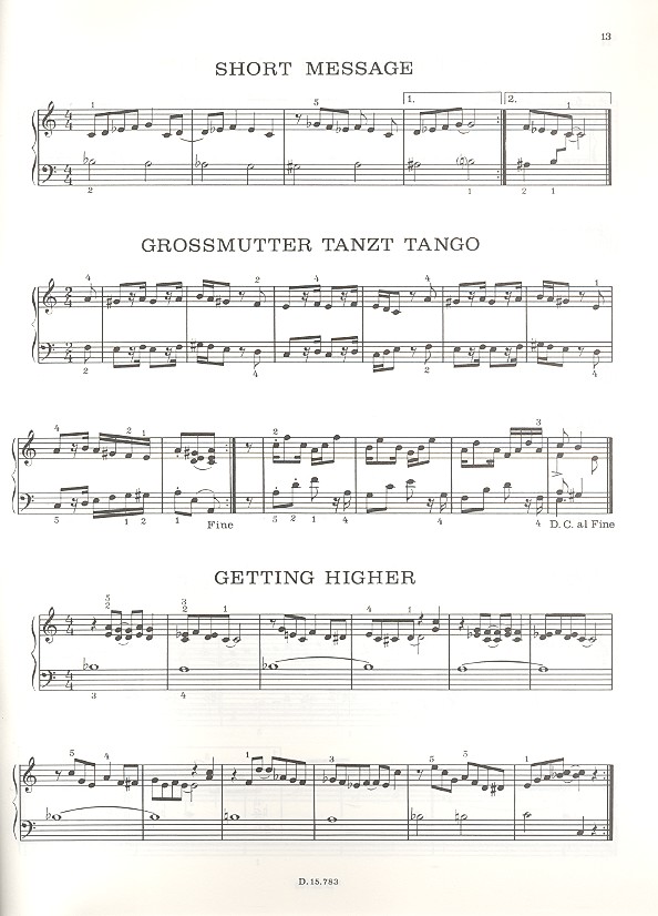 Three Finger BLues Tom Dooley Streichholzschachtel - Boogie Woogie Baila Chiquita Black is beautiful An der Nähmaschine Five Finger exercise Karawanen-Song Wie du mir so ich Dir Crocodile Blues She'll be coming (USA) So pfeifen alle Cowboys Sing tschiau ping Woodpecker Boogie Catching Butterflies Black Keys Danger on my way Come follow me Banana Boat Song (Trinidad) Bubble Gum Boogie Knitting needle Blues Short Message Großmutter tanzt Tango Getting higher Erstens kommt es anders Finger weg Just married When the Sainsta (USA) Fatty und Willi Blue Prelude Damals in Rio Sexten-Samba Jazzfan Duet Cafe Oriental Clouds and Leaves Close together Vaters liebstes Spielzeug Katzenjammer-Boogie Cool Love Boogie for my Mama Potato Rag Evening Walk Bi-Ba-Boogieman Rumba Romantica Blue Jeans Boogie Kommen und gehen Honky Tonk Piano Rag Formulas of Happiness Vienna Jazzland Rag Matilda (Jamaika) Elektronen Swinging at the 'Adebar'