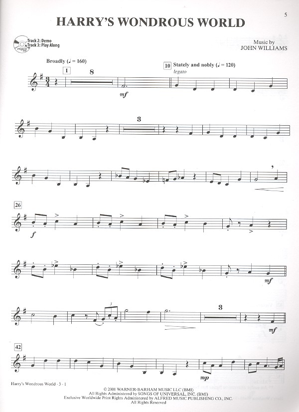 Selections from the complete Film Series Harry's wondrous World Family Portrait Hedwig's Theme Leaving Hogwarts Double Trouble A Window to the Past Fawkes the Phoenix Harry in Winter Hogwarts' Hymn Hogwarts' March Fireworks Wizard Wheezes Farewell to Dobby Obliviate Lily's Theme Statues This book is part of Alfred's Harry Potter Instrumental Solos series arranged for Flute, Clarinet, Alto Sax, Tenor Sax, Trumpet, Horn in F, Trombone, and optional Piano Accompaniment. All wind instrument arrangements are fully compatible and can be successfully performed as ensembles or solos by students who have completed the first book of any standard band method. A fully orchestrated accompaniment MP3 CD is provided, featuring each song as a live performance demo track followed by a play-along track. Due to level considerations regarding keys and instrument ranges, the wind instrument arrangements are not compatible with the string instrument arrangements in this series. This title is available in SmartMusic.