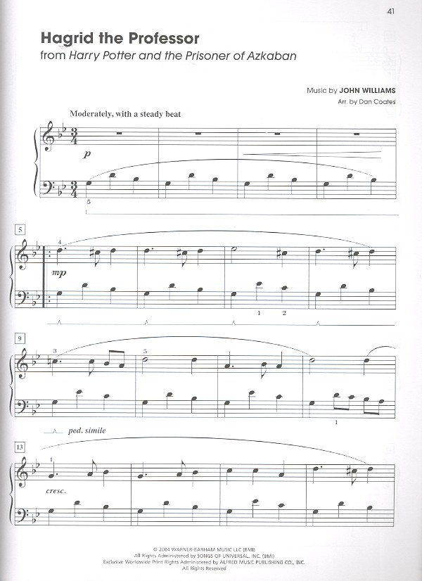 Selections from the complete Film Series Diagon Alley Family Portrait Harry's Wondrous World Hedwig's Theme Leaving Hogwarts Nimbus 2000 Voldemort The Chamber of Secrets Fawkes the Phoenix Buckbeak's Flight Double Trouble Hagrid the Professor Harry in Winter Hogwarts March Potter Waltz This Is the Night Dumbledore's Army Fireworks Loved Ones and Leaving Professor Umbridge Dumbledore's Farewell Harry and Hermione In Noctem When Ginny Kissed Harry Farewell to Dobby Godric's Hollow Graveyard Harry and Ginny Obliviate Ron Leaves Snape to Malfoy Manor Courtyard Apocalypse Harry's Sacrifice Lily's Lullaby Lily's Theme A New Beginning Severus and Lily Statues With the Harry Potter film series now complete, Alfred Music and Warner Bros. Entertainment are proud to present easy piano arrangements from the eight epic films together in one collectible volume. For the first time ever, 37 sheet music selections by John Williams, Patrick Doyle, Nicholas Hooper, and Alexandre Desplat are collected along with eight pages of color stills from The Sorcerer's Stone to The Deathly Hallows, Part 2. By popular request, 'Leaving Hogwarts' from The Sorcerer's Stone appears in print in this collection for the first time. It's a perfect gift for pianists of all ages who love the music of Harry Potter.