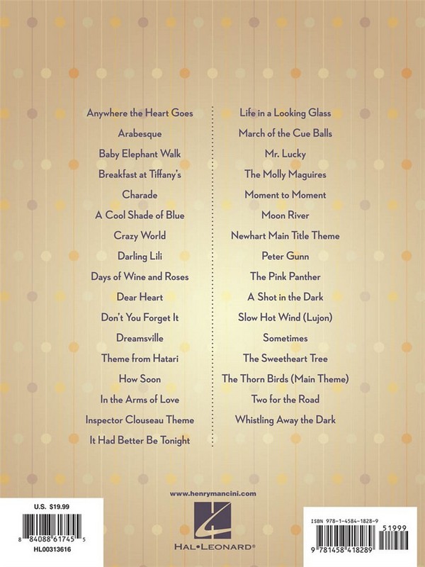 33 great Melodies A Cool Shade Of Blue A Shot In The Dark Anywhere The Heart Goes Arabesque Baby Elephant Walk Breakfast At Tiffany's Charade Crazy World Darling Lili Days Of Wine And Roses Dear Heart Don't You Forget It Dreamsville How Soon In The Arms Of Love Inspector Clouseau Theme It Had Better Be Tonight Life In A Looking Glass March Of The Cue Balls Moment To Moment Moon River Mr. Lucky Newhart Main Title Theme Peter Gunn Slow Hot Wind (Lujon) Sometimes The Molly Maguires The Pink Panther The Sweetheart Tree The Thorn Birds (Main Theme) Theme From Hatari Two For The Road Whistling Away The Dark