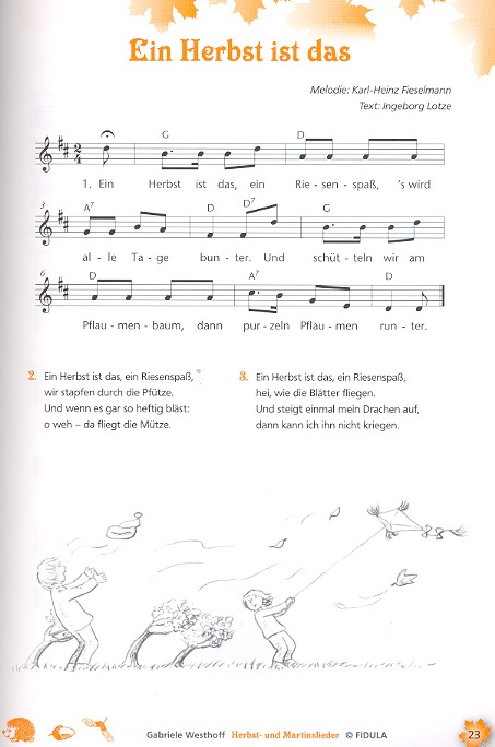 Erleben und Gestalten mit Stimme, Instrumenten, Bewegung und Material Der Herbst ist da: Bunt sind schon die Wälder Autumn comes Höhlenlied Herr Bst Sag nicht adieu Es pfeift der Wind: Wind, Wind, blase In Mutters Stübele Vent frais Nebel, Nebel, weißer Hauch: Feuchtes Nebelwetter Jede Stadt und jedes Land Es regnet, wenn es regnen will: No, no, no Was ist das für ein Wetter heut Novemberwetter Manchmal ist der Regen schön Schlampamper Erntezeit: Unter dem Birnbaum Im Häuschen mit 5 Stübchen Herbstmarkt Çekin halay Hejo, spann den Wagen an Blättertanz und Bäume: Es biegen sich die Bäume Falle, falle, gelbes Blatt Kastanienzeit und Nussmusik: Lauter kleine grüne Igel Ging ein Weiblein Nüsse schütteln Der Nussknacker Husten, Schnupfen, Heiserkeit: Alle Wetter, was für'n Wetter It's raining round Tiere im Herbst: Sieben Schwalben Leylek, leylek Fort, fort, fort und fort Vogelabschied Incy wincy spider Die Igelrugelei Drachen, Hexen und Gespenster: Hexen mit Besen Hundertzwei Gespensterchen Die Mühle, die braucht Wind: Das Mühlenrad Es klappert die Mühle am rauschenden Bach Guten Morgen, Herr Bäcker Sankt Martin: Kommt herab die dunkle Nacht Martin, Martin Laterne, Laterne: Ich geh mit meiner Laterne Licht in der Laterne Durch die Straßen auf und nieder Abends, wenn es dunkel wird Ich hab eine feine Laterne u. v. a. .