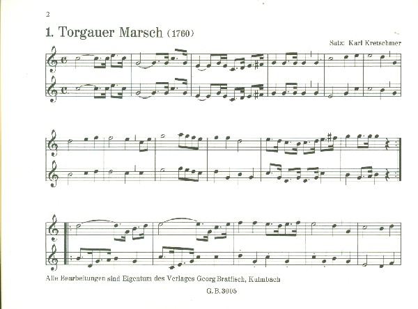 Schewe-Schröder, Cilly, ed Frankfurter Blockflöten-Hefte 4 Welsch, Franz, ed Kretschmer, Karl, ed Torgauer Marsch Finnländischer Reitermarsch Präsentier-Marsch Der alte Berner Marsch Hallstätter Marsch Marsch des 1. Garde-Bataillons Coburger Marsch Petersburger Marsch Hohenfriedberger Marsch