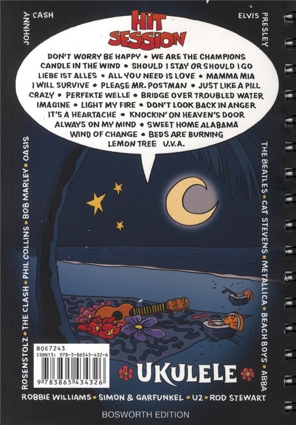 ...Das fehlte noch: Ein Songbook für Ukulele - genau so klein & praktisch wie die Ukulele selbst, zum überall hin Mitnehmen. Damit hat die Ukulele endlich einen festen Freund und einen ständigen Begleiter! Die Songbooks der HIT SESSION sind sowieso die idealen Begleiter, weil Sie eine Ring-bindung haben (einfaches Blättern und Aufschlagen der Songs) und alle Songs darüber hinaus einmal als Text mit Akkord- symbolen und einmal als Melodielinie mit Text & Akkordsymbolen notiert sind. Einfacher geht's nicht! Damit gehört ab sofort an jedes Lagerfeuer und an jeden Strand, in jeden Wald und in jede Hütte, auf jedes Ferienlager und auf jede Rücksitzbank eine Ukulele nebstzugehöriger Hit Session. Ist das nicht wunderbar?! Hit Session Din A5 Ringbindung Spirit Of Hawk City lights Whiskey In The Jar Father And Son Lemon Tree Johnny B Imagine Barbara Ann Could You Be Loved El Condor Pasa (If I Could) Mr. Tambourine Man No Woman, no cry The Times They Are A-Changin' American Pie Bridge Over Troubled Water Cecilia Bye Bye Love Every Breath You Take A Hard Day's Night All My Loving All You Need Is Love Help! Hey Jude I Should Known Better Downtown City Of New Orleans Candle In The Wind Blaze of Glory Dancing Queen Mamma Mia Super Trouper California Dreamin' Let It Be! Nowhere Man Ob-La-Di, Ob-La-Da Ticket To Ride Can't Buy Me Love With A Little Help From My Friends Mrs. Robinson Sound Of Silence The Boxer Knockin' On Heaven's Door Heaven Wonderwall In The Ghetto I Will Survive She's The One Wind Of Change Sailing San Francisco (Be Sure To Wear Some Flowers In Your Hair) Sweet Home Alabama LOVE HURTS Nazareth, Everly Brothers WHEN THE RAIN BEGINS TO FALL (Jermaine Jackson) DON'T WORRY BE HAPPY Liebe ist alles LAY BACK IN THE ARMS OF SOMEONE (Smokie) Alright (Reamon) IF TOMORROW NEVER COMES (Gath Brooks, Ronan Keating) DUST IN THE WIND (Kansas) GROOVY KIND OF LOVE (Phil Collins) ME AND BOBBY MCGEE (Janis Joplin) PLEASE MR. POSTMAN Just like a pill (Pink) CRAZY (Aerosmith) I JUST CALLED TO SAY I LOVE YOU Perfekte Welle DANCING IN THE STREET (Mick Jagger/David Bowie) WONDERFUL TONIGHT (Eric Clapton) Vertigo I Don't Like Mondays ROCKIN ALL OVER THE WORLD (Status Quo) REDEMPTION SONG SULTANS OF SWING (Dire Straits) SUNDAY BLOODY SUNDAY WE ARE THE CHAMPIONS (Queen) BROTHERS IN ARMS (Dire Straits) TEARS IN HEAVEN (Eric Clapton) WE CAN WORK IT OUT (Beatles) When I'm Sixty Four YELLOW SUBMARINE TAKE A CHANCE ON ME DON'T LET ME BE MISUNDERSTOOD Santa Esmeralda GET BACK (Beatles) THE LOGICAL SONG (Supertramp) SITTING ON THE DOCK OF THE BAY LIGHT MY FIRE (Doors) Summer Of '69 (Bryan Adams) THE LADY IN RED I GOT YOU BABE (Bono & Cher) DON'T LOOK BACK IN ANGER (Oasis) BEDS ARE BURNING (Mitnight Oil) In the shadows (The Rasmus) DOWN ON THE CORNER SHOULD I STAY OR SHOULD I GO (The Clash) Somethings burning (Kenny Rogers) Always on my mind (Willie Nelson, Pet Shop Boys) I walk the line (Johnny Cash) It's a heartache (Bonnie Tyler) Rose garden (Lynn Anderson) True Colours (Cyndy Lauper)