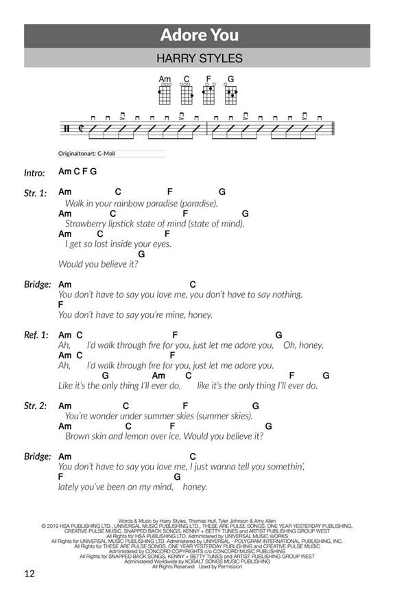 Er ist endlich da: der dritte Teil des erfolgreichen Hitbooks beinhaltet weitere 100 aktuelle Chartshits wie auch Top-Titel der letzten Jahre für Ukuele. Jeder Song ist zwei Mal notiert - einmal mit Melodielinie und Akkorden und zusätzlich als Text mit Akkorden. Die Arrangements sind mit Formteilen, Angabe der Originaltonart sowie Schlagmustern versehen. So lassen sich die Songs noch leichter erarbeiten. Die Ausgabe ist im größeren Format mit benutzerfreundlicher Spiralbindung. Ein Streaming-Link im Buch zu den Originaltiteln ist auch wieder mit dabei. Die Ausgabe ist im größeren Format mit benutzerfreundlicher Spiralbindung. Ein Streaming-Link im Buch zu den Originaltiteln ist auch wieder mit dabei. 1. 7 Rings [Ariana Grande] 2. A Million Dreams [P!nk] 3. Adore You [Harry Styles] 4. American Woman [Lenny Kravitz] 5. An guten Tagen [Johannes Oerding] 6. Bad Bad Leroy Brown [Jim Croce] 7. Bad Guy [Billie Eilish] 8. Be Alright [Dean Lewis] 9. Better [Lena] 10. Blinding Lights [The Weeknd] 11. Bobby Brown [Frank Zappa] 12. Bones [Galantis] 13. Born To Run [Bruce Springsteen] 14. Break My Stride [Matthew Wilder] 15. Brothers In Arms [Dire Straits] 16. Burning The Heather [Pet Shop Boys] 17. California Blue [Roy Orbison] 18. Can't Take My Eyes Off Of You [Frankie Valli] 19. Castles [Freya Ridings] 20. Crazy [Gnarles Barkley] 21. Dancing In The Dark [Bruce Springsteen] 22. Dancing with a Stranger [Sam Smith] 23. Do You Really Want To Hurt Me [Boy George] 24. Don't Call Me Up [Mabel] 25. Don't Start Now [Dua Lipa] 26. Du [Joris] 27. Everything I Wanted [Billie Eilish] 28. Fading [Ilira] 29. Flames [David Guetta] 30. Fuckin' Perfect [P!nk] 31. Giant [Calvin Harris] 32. Hard Rock Café [Carole King] 33. Here With Me [Dido] 34. Heroes [David Bowie] 35. Hier mit dir [Wincent Weiss] 36. High Hopes [Panic! At The Disco] 37. Hold My Girl [George Ezra] 38. I Am I Said [Neil Diamond] 39. I Am What I Am (from La Cage Aux Folles) [Gloria Gaynor] 40. I Don't Care [Ed Sheeran] 41. In meiner Erinnerung [Silbermond] 42. In My Mind [Dynoro] 43. Into The Great Wide Open [Tom Petty] 44. Je ne parle pas francais [Namika] 45. Lay Down Sally [Eric Clapton] 46. Let You Love Me [Rita Ora] 47. Liebe auf Distanz [Revolverheld] 48. Love On Myself [Calum Scott] 49. Material Girl [Madonna] 50. ME! [Taylor Swift] 51. Memories [Maroon 5] 52. More Than This [Roxy Music] 53. Narcotic [Younotus] 54. Natural [Imagine Dragons] 55. Nothing Breaks Like A Heart [Miley Cyrus] 56. Old Town Road [Lil Nas X] 57. Only Human [Jonas Brothers] 58. Only Thing We Know [Alle Farben] 59. Open Up [Matt Simons] 60. Orphans [Coldplay] 61. Paid My Dues [Anastacia] 62. Paradise [George Ezra] 63. Part Time Lover [Stevie Wonder] 64. Power Over Me [Dermot Kennedy] 65. Promises [Calvin Harris] 66. Ride Like The Wind [Christopher Cross] 67. Roxanne [The Police] 68. Salt [Ava Max] 69. Senorita [Shawn Mendes] 70. Shallow [Lady Gaga] 71. Shotgun [George Ezra] 72. So Am I [Ava Max] 73. Solo [Clean Bandit] 74. Someone You Loved [Lewis Capaldi] 75. Speechless [Robin Schulz] 76. Starman [David Bowie] 77. Strawberry Fields Forever [The Beatles] 78. Sugar Sugar [The Archies] 79. Sweet But Psycho [Ava Max] 80. The Road To Hell (Part 2) [Chris Rea] 81. The Sun Ain't Gonna Shine Anymore [The Walker Brothers] 82. The Wild Boys [Duran Duran] 83. The Wild Rover 84. Thunderclouds [Labrinth] 85. Torn [Ava Max] 86. Tu m'appelles [Adel Tawil] 87. Unchained Melody [The Righteous Brothers] 88. Unendlich [Sarah Connor] 89. Urgent [Foreigner] 90. Valerie [Amy Winehouse] 91. Walking On Sunshine [Katarina & The Waves] 92. Walking On The Moon [The Police] 93. Wellerman 94. Wind of Change [Scorpions] 95. Wish You Were Here [Pink Floyd] 96. Wonderwall [Oasis] 97. You Can Get It If You Really Want [Desmond Dekker] 98. You Can't Hurry Love [Phil Collins] 99. Your Song [Elton John] 100. Zuhause [Max Giesinger]