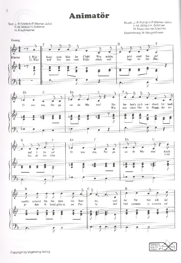 Animatir Hey Kölle du bes a Jeföhl Kumm loss mer fiere Nemm mich su wie ich ben Mona Lisa Vorbei es vorbei Jode lade he Fc Leed Minsche wie mir Kumma da Wann jeit dr Himmel widder op Willy, wat wör Kölle ohne dich