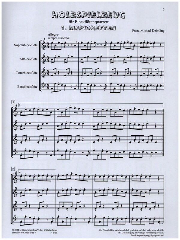 Das 'Holzspielzeug' besteht aus drei Miniaturen für Blockflötenquartett: Marionetten, Holzkugeln und Bauklötze. Alle drei kleinen Stücke haben einen ganz unterschiedlichen Charakter und bestechen durch eine sehr bildliche Klangsprache. 'Holzspielzeug' entstand für das professionelle Blockflötenensemble 'La Fluterie'. Da es leicht bis mittelschwer ist, eignet es sich aber auch sehr gut für Musikschul- und Laien-Ensembles.