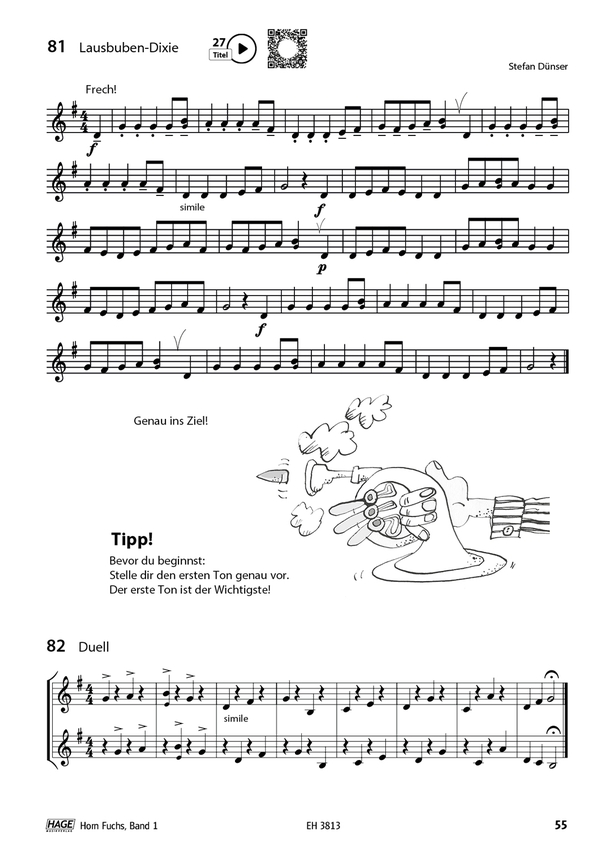 Stopfner, Andreas, Koautor Die geniale und spaßige Hornschule in F und B Die geniale und spaßige Hornschule für den Einzel- und Gruppenunterricht Spielerisch und mit Begeisterung erlernen Anfänger Schritt für Schritt das Hornspiel. Viele neue, aber auch bewährte methodische Wege sind in diese Schule eingearbeitet. Der Horn Fuchs macht den Schülern einfach Spaß und führt sie spielerisch zum Erfolg. Internationale Spitzenlehrer empfehlen diese Buchreihe. Warum? Weil das Konzept der erfolgreichen Fuchs Bücher wirklich funktioniert. Unzählige tolle Solostücke und Duette, musikalisch wertvolle Etüden, technische, flexibilitäts- und ansatzaufbauende Übungen sowie ein lyrisch-sanglicher Zugang zur Kunst des Hornspiels tragen mit dazu bei, dass die Schüler nicht nur gut spielen lernen, sondern auch gut klingen. Markenzeichen dieser Schule ist auch ihr Humor: Mit zahlreichen Comics wird die Aufmerksamkeit der Schüler und Lehrer dorthin gelenkt, wo sie sein soll: zur Freude am Musizieren. Zu vielen Übungen gibt es auch tolle Playbacks per QR-Code zum Anhören, die man ganz einfach über Smartphone oder Tablet abspielen kann. So macht das Üben besonders viel Spaß. Der Horn Fuchs eignet sich ideal für den Einzel- und Gruppenunterricht für B- und F-Horn. Das ausgefuchste Lehrkonzept ist auch für Trompete, Flügelhorn, Posaune, Tuba und Klarinette erhältlich.