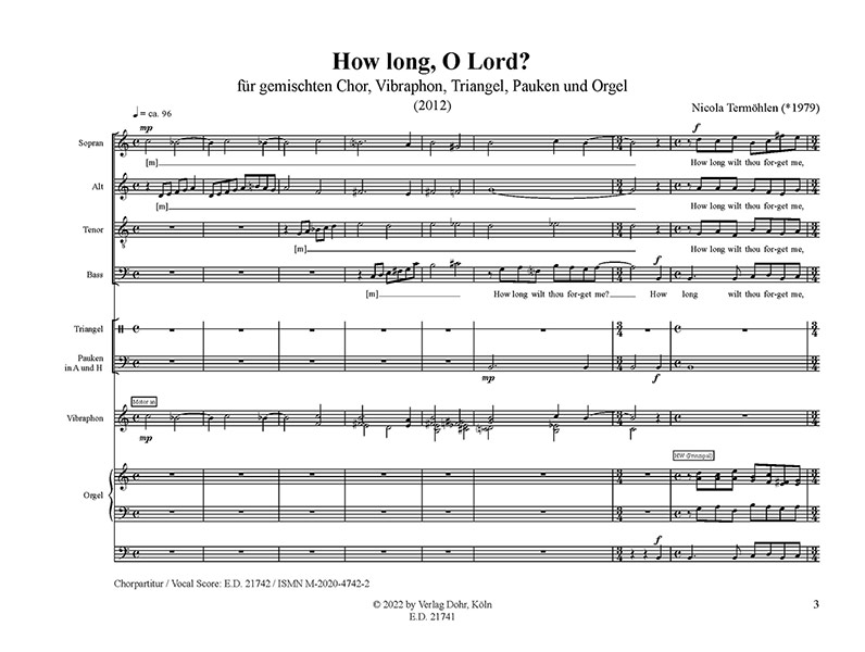 | Untertitel: | für gem Chor, Vibraphon, Trangel, Pauken und Orgel Partitur und Stimmen |