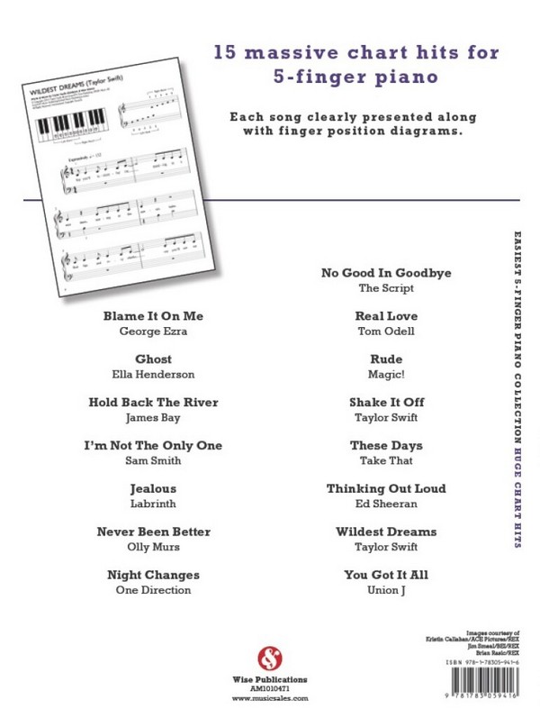 Easiest 5-Finger Piano Collection Blame It On Me (Ezra, George) Ghost (Henderson, Ella) Hold Back The River (Bay, James) I'm Not The Only One (Smith, Sam) Jealous (Labrinth) Never Been Better (Murs, Olly) Night Changes (One Direction) No Good In Goodbye (Script, The) Real Love (Odell, Tom) Rude (Magic!) Shake It Off (Swift, Taylor) These Days (Take That) Thinking Out Loud (Sheeran, Ed) Wildest Dreams (Swift, Taylor) You Got It All (Union J)
