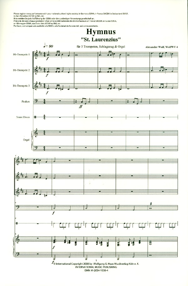 | Untertitel: | 3 Trompeten, Pauken, Snare Drum und Orgel Partitur und Stimmen |