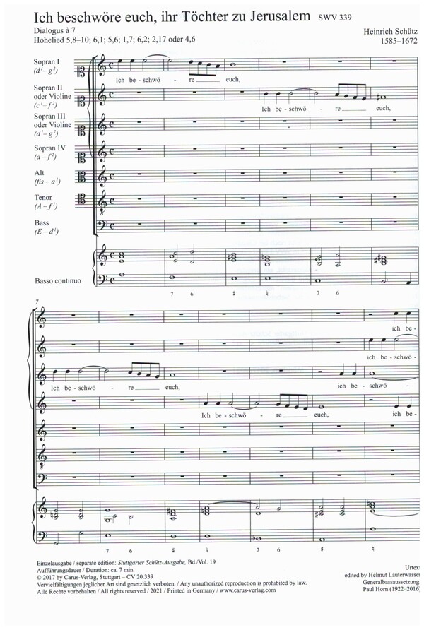 Dialogus à 7 Ich beschwöre euch, ihr Töchter zu Jerusalem" gehört zur Gattung der Dialog-Kompositionen, die sich im protestantischen Deutschland im 17. Jahrhundert wegen ihrer lebendigen Darstellung der Bibeltexte großer Beliebtheit erfreuten. Schütz vertont Verse aus dem Hohelied, dabei übernimmt ein Hochchor aus vier Sopranen die Worte Sulamiths, und ein dreistimmiger Tiefchor repräsentiert die "Töchter zu Jerusalem", erst am Schluss werden die beiden vereint. Im Hochchor können zwei der vier Soprane von zwei Violinen ersetzt werden. Ein außergewöhnliches Stück für Chöre mit guten Sopranstimmen oder Solistinnen. Einzelausgabe aus Bd. 19 der Stuttgarter Schütz-Ausgabe (Gesamtausgabe Carus 20.919)