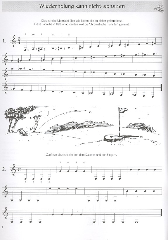 Ich spiele Gitarre! ist eine neuartige Schule für Anfänger auf der Gitarre ab neun oder zehn Jahren. Jeder Band enthält viele bekannte Lieder verschiedener Musikrichtungen, wie z.B. Klassik, Pop, Blues oder Folk. Neu ist, dass in Ich spiele Gitarre! neben dem Spielen von Melodien auch besonderer Wert auf das Erlernen und Spielen von Akkorden gelegt wird. Schritt für Schritt wird der Gitarrenschüler in die Geheimnisse des Gitarrenspiels eingeweiht. Jede Menge Übungsstücke, lustige Spiele, Rätsel und Gehörübungen sorgen für viel Abwechslung. Selbst Improvisieren und Komponieren sind in den fünf Bänden dieser Schule ein Thema. Schon nach wenigen Wochen werden auch Ihre Schüler stolz sagen können: Ich spiele Gitarre!Band 4 beschäftigt sich mit: Zweistimmigem Spiel, Dynamik, A-Dur, Bluesakkorden, der zweiten Lage, neuen Schlagtechniken, Bass- und Stammtönen.