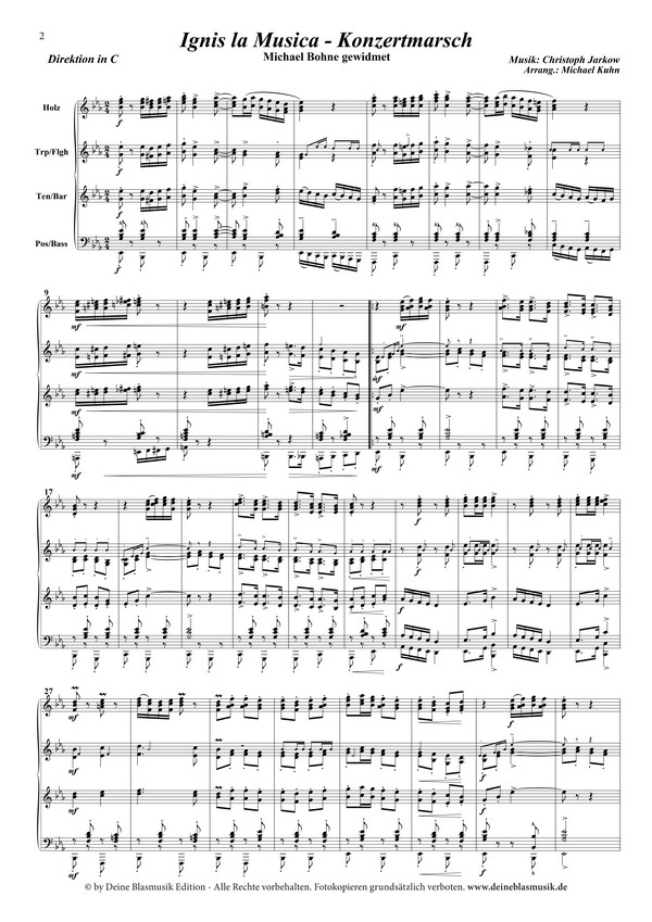 Kuhn, Michael, arr. 'Feurig' wie es der Titel des Werkes verspricht, erscheint 'Ignis la musica' von Christoph Jarkow. Ton für Ton und mit Leidenschaft zur Musik geschmiedet, entstand ein anspruchsvoller und imposanter Konzertmarsch, der von Michael Kuhn in ein atemberaubendes Arrangement gegossen wurde. Spielerisches Können und technische Raffinesse belohnen Musiker und Publikum gleichermaßen mit einem großartigen musikalischen Erlebnis. Bereits die Einleitung lässt harmonisch alle Funken sprühen und trägt die großen Linien zu einem lyrischen Trio, das zu Beginn von Flöten und Tenören getragen wird und in einem furiosen Tutti-Feuerwerk endet.