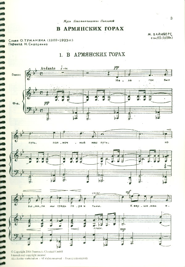 Liederzyklus auf Gedicht von Howhaness Tumanjan Inhalt: 1. In den armenischen Bergen 2. Vierzeiler 3. Trauriges Gespräch 4. Lied des Pflügers 5. Der Bach 6. Der Ruf des Frühlings 7. Unser Schwur
