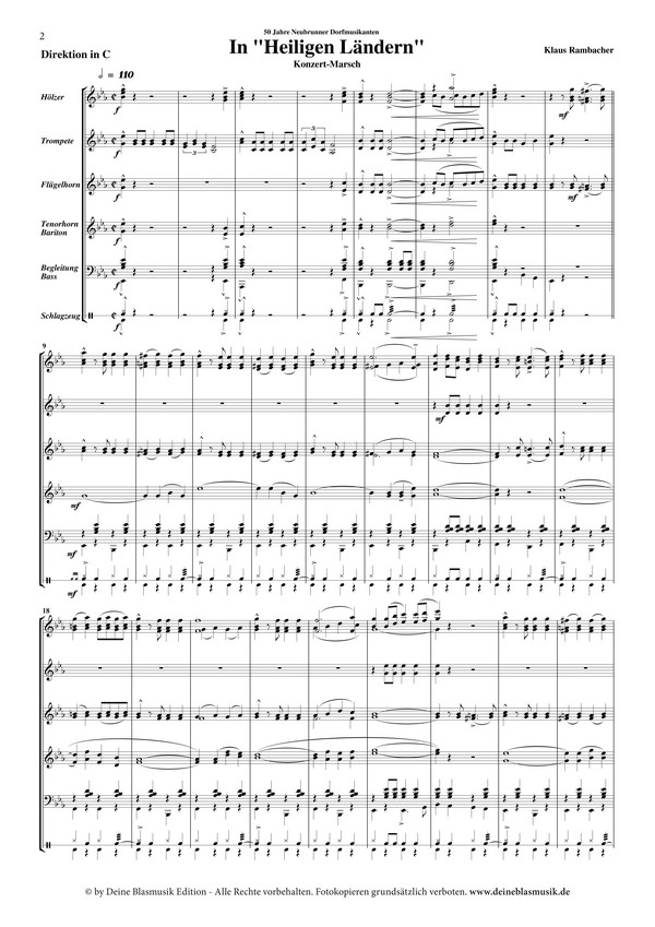 Klaus Rambachers Konzertmarsch 'In heiligen Ländern' entstand zum 50. Jubiläum der Neubrunner Dorfmusikanten. Neubrunn liegt im Herzen der 'Heiligen Länder', wie der Landstrich in den unterfränkischen Haßbergen bezeichnet wird. Dort sollen die Menschen früher besonders fromm gewesen sein, was unter anderem durch eine Vielzahl von Feldkreuzen und Bildstöcken dokumentiert ist.