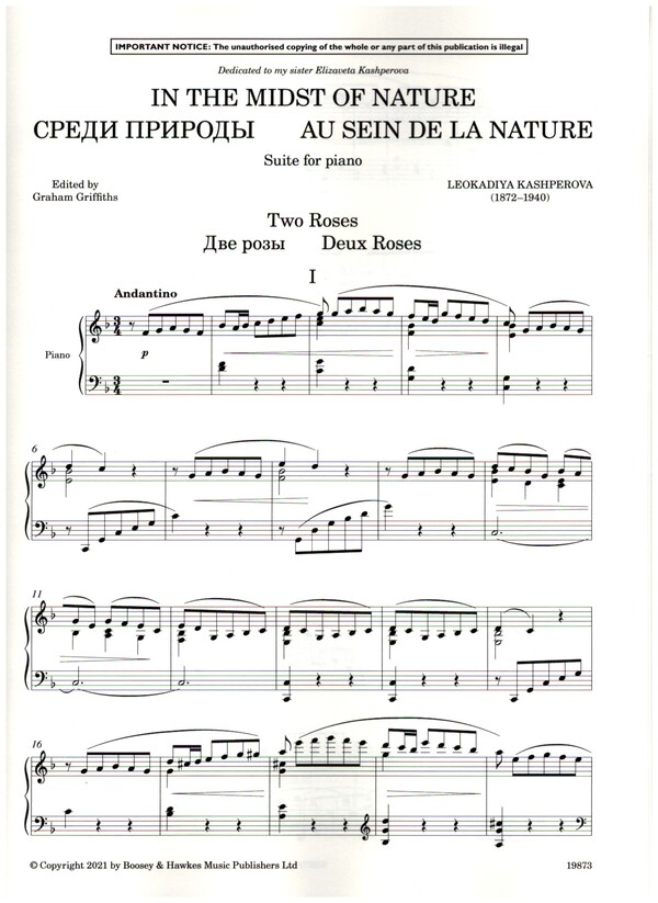 Kashperova Edition Griffiths, Graham, ed Suite for piano solo in six movements Leokadiya Kashperova (1872-1940), die als die Klavierlehrerin von Igor Strawinsky bislang nur als eine Randfigur in die Musikgeschichte eingegangen ist, erfreut sich jüngst einer großen Wiederentdeckung. Mit gleich zwei Abschlüssen am St. Petersburger Konservatorium ausgestattet, trat sie als virtuose Pianistin und der romantischen Tradition verpflichteten Komponistin in Erscheinung. Sie stand einigen der größten Musiker ihrer Zeit nahe, darunter Mily Alexejewitsch Balakirew und Leopold von Auer. Sie konzertierte in den 1900er-Jahren sowohl in Deutschland als auch in Großbritannien, aber ihre Karriere ebbte nach den 1920er-Jahren ab. Auf Grundlage dieser nun vorliegenden beiden Neuausgaben von Kashperovas Cellosonaten Nr. 1 und 2 wurden bereits Aufführungen im Rundfunk ausgestrahlt und auf CD eingespielt. Weitere Neuausgaben ihrer Sinfonie und ihres bislang unveröffentlichten Klavierkonzertes sind ebenfalls kürzlich erschienen. Kashperovas romantische Empathie für Natur und Kindheit lässt sich wohl am eindringlichsten in ihrer Kammermusik und in ihren Liedern erleben. Die aus sechs Sätzen bestehende Suite In the Midst of Nature (1910) bildet in dem Sinn keine Ausnahme, als dass hier ebenfalls die Natur heraufbeschwört wird, mit der die Komponisten die Sehnsucht nach ihrer Kindheit in einer friedvollen und entlegenen russischen Landschaft ausdrückt. In the Midst of Nature zeigt außerdem eine kunstvoll Zusammenstellung im Hinblick auf Schwierigkeitsgrade, was darauf hindeutet, dass Kashperova diese Musik vermutlich mit ihren vielen Schülerinnen und Schülern teilte: die ersten Sätze liegen innerhalb der Möglichkeiten eines talentierten jungen Klavierspierspielers, während die letzte Sätze die Technik und die interpretatorische Reife einer Studentin an einer Musikhochschule erfordern. Das ganze Werk eignet sich hervorragend für einen professionelles Klavierabend.