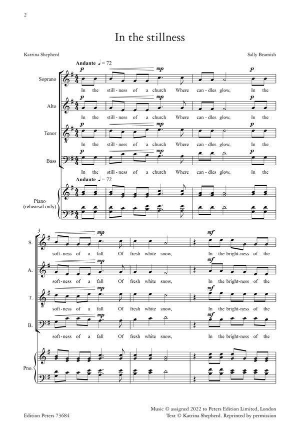 In the stillness von Sally Beamish ist ein kurzes zeitgenössisches Weihnachtslied für gemischten Chor. Mit dem Originaltext von Katrina Shepherd fängt dieses kurze Weihnachtslied die stille Entrückung einer kleinen Pfarrkirche in einer verschneiten Landschaft kurz vor Weihnachten ein.