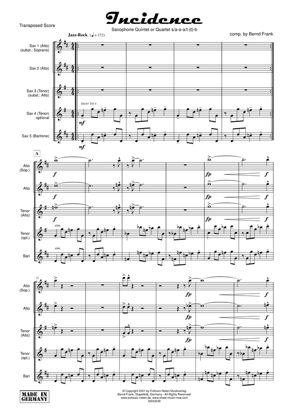 Wir schreiben das Jahr 2021. Seit Beginn der Corona-Pandemie hört man kaum ein anderes Wort so häufig wie Inzidenz, oder auf Englisch Incidence. Daher sollte meine nächste Komposition einfach so heißen. Wie die täglich wiederkehrenden Zahlen kommt im Bariton das stetige Begleitriff, über dem einige Akkorde und Phrasen in den anderen Stimmen einsetzen. Eine richtige Melodie gibt es nicht, da dem täglichen Leben seit der Pandemie auch die Melodie etwas abhandengekommen ist. Stattdessen wandert das Geschehen auf und ab: zunächst betrifft es vor allem das Bass-Riff in den tiefen Stimmen. Ab dem durchführenden Teil D steigen die Tonhöhen dann bis zu einem Höhepunkt einige Takte vor E. Natürlich muss in Epidemiezeiten im Anschluss ab Teil F ordentlich improvisiert werden (erste und/oder dritte Stimme). Nach Belieben könnte das D.S. für weitere Soli auch bei D gemacht werden, um den Teil vor dem nächsten Solo noch einmal zu wiederholen. Im Anschluss geht es wieder ganz von vorn los. Theoretisch hat das Stück gar kein Ende, praktisch gesehen sollte man aber dennoch irgendwann beim Kopf in die Coda springen, bevor der Baritonspieler tot umgefallen ist. Das Arrangement soll vor allem eins, nämlich Spaß machen und die vielen ausgefallenen Partys und Konzerte in Jazzclubs und Bars wieder ein bisschen wettmachen. Bernd Frank im Jahre 1 nach Coronae Geburt