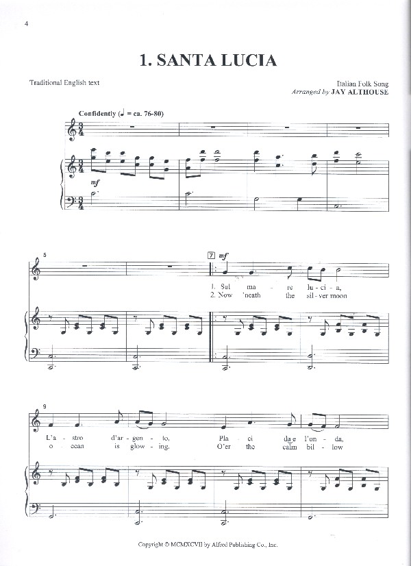 Santa Lucia Cara Mamma Schlaf in guter Ruh Guter Mond Valencianita A la nanita nana Auprès de ma blonde Chevaliers de le table ronde Siyahamba The last Rose of Summer All my Trials The Jones Boys 12 Songs from around the World for Recitals, Concerts and Contests
