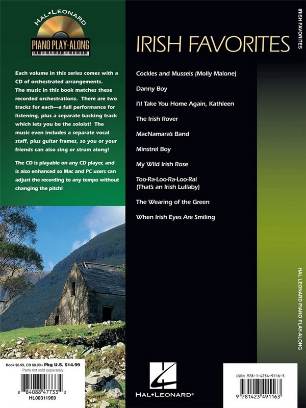Play 10 Favorites with Notation ad Sound-alike CD Tracks Cockles and Mussels Danny Boy I'll take You home again Kathleen MacNamara's Band Minstrel Boy My wild Irish Rose The Irish Rover The Wearing of the Green Too-ra-loo-ra-loo-ral (That's an Irish Lullaby) When Irish Eyes are smiling