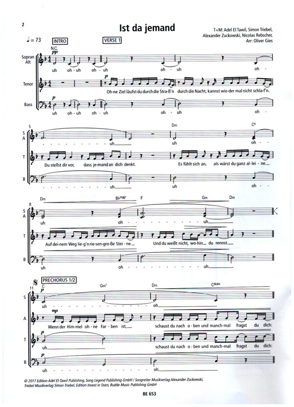 Für Chor gemacht Triebel, Simon, Koautor Zuckowski, Alexander, Koautor Rebscher, Nicolas, Koautor Gies, Oliver, arr. Ist da jemand, der die Dinge genauso sieht wie ich, der fühlt wie ich und mit mir zusammen etwas größeres schaffen will? Den beliebten Song Da ist jemand, der dein Herz versteht und der mit dir bis ans Ende geht von Adel Tawil gibt es jetzt auch als Chor-Arrangement von Oliver Gies.