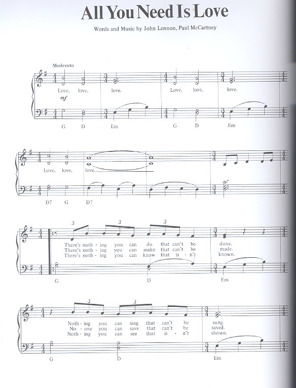 THE BEATLES, GRUPPE ALL YOU NEED IS LOVE AND I LOVE HER BLACKBIRD DAY TRIPPER ELEANOR RIGBY EIGHT DAYS A WEEK THE FOOL ON THE HILL GETTING BETTER GOOD DAY SUNSHINE A HARD DAY'S NIGHT HERE THERE AND EVERYWHERE HEY JUDE LET IT BE THE LONG AND WINDING ROAD MAXWELL'S SILVER HAMMER NORWEGIAN WOOD THIS BOY : RINGO'S THEME TICKET TO RIDE WE CAN WORK IT OUT WHEN I'M SIXTY FOUR WITH A LITTLE HELP FROM MY FRIENDS YESTERDAY