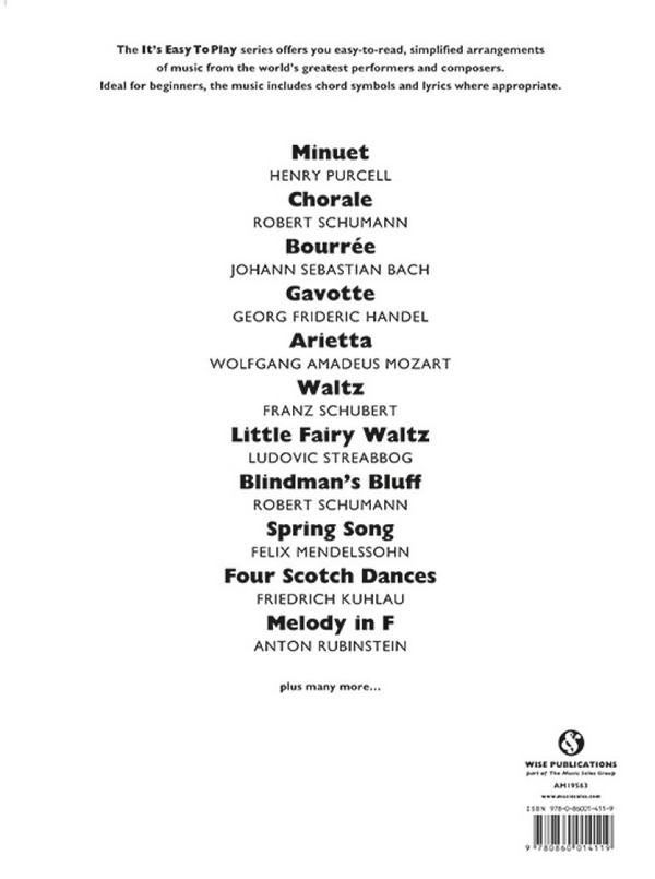 A Song (Gurlitt) Air (WF bach) Allegretto Scherzando (CPE Bach) Arietta (Mozart) Barcarolle (Offenbach) Blindmans Buff (Schumann) Bourree (Bach) Bourree (Händel) Bourree (Krieger) Chorale (Schumann) Evening Star (Wagner) Four Scotch Dances (Kuhlau) Gavotte (Händel) German Dance (Haydn) German Dance 2 (Haydn) In May (Behr) Little Fairy Waltz (Streabbog) Melody (Schumann) Melody In F (Rubinstein) Minuet (Bach) Minuet (Bach) Polka In G Minor (Glinka) Sonata (Scarlatti) Sonatina (Biehl) Spring Song (Mendelssohn) Studio (JCF Bach) The Cuckoo (Müller) The Dolls Complaint (Franck) The Happy Farmer (Schumann) Two Minuets (L.Mozart) Walking (Diabelli) Waltz (Schubert) Wedding March (Mnedelssohn/Wagner))