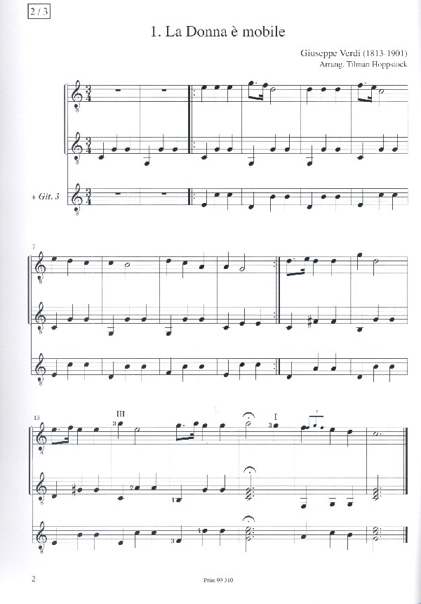 Musikalische Reisen für Kinder und Erwachsene Band 3 La donna è mobile (Verdi) Oh che bello castello Bentornati figlioletti Carneval Der Frühling (Vivaldi) Funiculi funicula (Denza) Caro mio ben (Giordani) Fratelli d'Italia (Novaro) So ben mi chi hà (Negri) Concerto (Vivaldi) Italiana (Anonymus) Aria (Frescobaldi) Una mattina Tarantella Ricercar (Bossinensis) Allegretto (Carulli) Adagio (Reggio) Studio (Giuliani) Preludio (Carcassi) Andantino (Carulli) Caprice Nr.24 (Paganini)