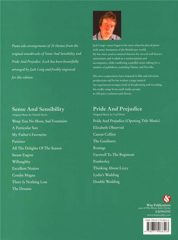 Patrick Doyle Sense and Sensibility (1995) Weep you no more, sad Fountains A particular Sum My Father's favourite Patience All the Delights of the Season Steam Engine Willoughby Excellent Notion Combe magna There is nothing lost The Dreame Carl Davis: Pride and Prejudice (1995, kate winslet) Pride and P rejudice (opening title music) Elizabeth observed Canon Collins The Gardiners Rosings Farewell to the Regiment Pemberley Thinking about Lizzy Lzdia's Wedding Double Wedding