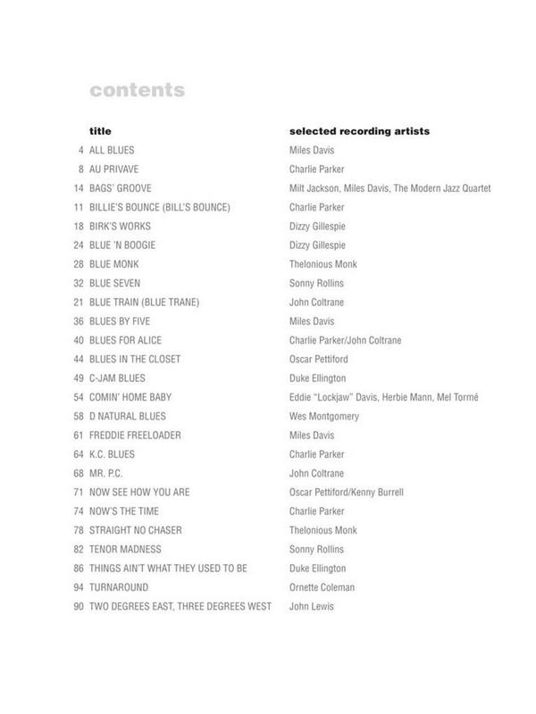 All Blues Au privave Billie's bounce Birk's works Blue monk Blue train Blues for Alice Blues in the closet C-jam blues D natural blues Freddie Freeloader K.C. blues Mr. P.C. Now's the time Straight no chaser Tenor madness Things ain't what they used to be