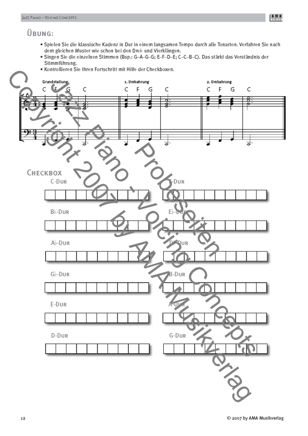 jazz workbooks Jazz Piano - Voicing concepts richtet sich in erster Linie an 'Nicht-Pianisten' (Saxophonisten, Gitarristen, Sänger etc.), die ihr Jazz-Piano-Verständnis erweitern möchten. Voraussetzung zur Arbeit mit dem Buch ist die Fähigkeit, Noten im Violin- und Bass-Schlüssel zu lesen. Daneben sollte die Struktur der Klaviatur bekannt sein sowie grundlegende theoretische Kenntnisse wie z.B. Tonarten, Intervalle und Kenntnis der Durtonleiter. Da das Buch für das Selbststudium ausgerichtet ist, finden sich im separaten zu allen Beispielen auch Lösungsvorschläge. Es ist sehr empfehlenswert, das Buch von vorne durchzuarbeiten, damit der Inhalt nachhaltig verinnerlicht wird. Auch bereits fortgeschrittene Pianisten sollten das erste Buch BASICS durcharbeiten, um sicherzustellen, dass keine Wissenslücken bei der Akkordbildung vorhanden sind. Im Gegensatz zur klassischen Klavierausbildung werden in diesem Buch keinerlei technische Fingerübungen, sondern im wesentlichen Voicings (Akkordstrukturen) gezeigt. Es ist in jedem Fall empfehlenswert, bei einem qualifizierten Lehrer Unterricht zu nehmen, um auch die anderen Aspekte des Klavierspiels (Geläufigkeit, Notenkenntnisse, Repertoire, Interpretation, Improvisation etc.) zu erlernen. Voicing Concepts ist konzipiert, um den traditionellen Klavierunterricht im Thema Akkordbildung zu unterstützen. Das Verstehen und Umsetzen von Akkordsymbolen gehört zu den handwerklichen Grundlagen im Jazz. Das Klavier ist das ideale Instrument, um harmonische Strukturen überblicken zu lernen und ist somit u. a. für Nicht-Pianisten ein wichtiges Hilfsmittel. Auch in diesem Sinne verfolgen die einfachen und klar strukturierten Übungen in voicing concepts das Ziel, sowohl typische als auch komplexe harmonische Abläufe in Jazz-Standards mit gut klingenden Voicings und in stilistisch unterschiedlichen Grooves improvisatorisch gestalten zu lernen und dabei Wesentliches über harmonische/melodische Zusammenhänge im Jazz zu erfahren. Der Autor Philipp Moehrke, der am Berklee College of Music seinen Abschluss in Jazz Piano & Arrangement gemacht hat, und als Pianist, Komponist, Arrangeur und Produzent in stilistisch unterschiedlichen Bereichen sowie für Film-, Theater- und Musicalproduktionen tätig ist, hat mit Voicing concepts das erste von drei Jazz-Piano Bücher veröffentlicht, die auch in englischer Sprache erschienen sind. In acht umfangreichen Kapiteln lernt der (Nicht-)Pianist alles von den Basics, der Dur- und Molldiatonik (Stufenakkorde und II-V-I-Kadenz), über Left Hand Voicings (z. B. Bud Powell, Spread Voicings, Guide Tone) und Two Hand Voicings (Drop 2 und Upper Structure). Die ausführlichen Kapitel über die Reharmonisation (z. B. Vertreterdominanten, chromatische Annäherung, Gegenbewegung) und die Grooves (z. B. Jazz Waltz, Easy Stride, Walking Bass oder Bossa Nova) geben Beispiele, wie der Spieler einen gleichförmigen harmonischen Verlauf abwechslungsreicher gestalten kann. Das Kapitel über Arrangement-Techniken, in denen der Autor zeigt, wie man Melodie, Bass, Guide-Töne, Akkorderweiterungen und Rhythmus kombinieren kann, schließt den Lehrgang ab. Neben einer CD und einem Lösungsheft, sind die Kapitel mit Aufgaben an den Musiker durchsetzt, bei denen sich der Musiker mit dem Hören, Analysieren, Reharmonisieren und Aufschreiben von Harmonien befassen muss und damit die Grundlagen des Jazz noch besser verinnerlichen kann. Ausgezeichnet wurde dieses durchdachte Arbeitsbuch mit dem Musikeditionspreis in der Kategorie Schul- und Unterrichtsliteratur für Erwachsene.