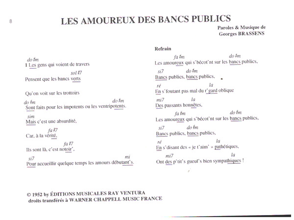 Les anoureux de bancs publics Au bois de mon coeur Auprès de mon arbre Brave margot La cane de Jeanne Chanson pour l'auvergnat La chasse aux papillons Les copains d'abord Dans l'eau de la claire fontaine Fernande Funerailles d'antan Le gorille J'ai rendez-vois avec vous Je me suis fait tout petit Marquise La mauvaise reputation Mourir pour des idess La non-demande en mariage Le parapluie Le pornographie La priere Les sabots d'Hélène Supplique pour etre enterre a la Plage de sete Une jolie fleur Le vieux leon