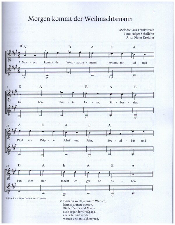 Nachfolgeausgabe für ED20899 Kreidler, Dieter, ed Die schönsten Advents- und Weihnachtslieder Es ist ein Ros' entsprungen Leise rieselt der Schnee Engel lassen laut erschallen (Gloria) O du fröhliche Alle Jahre wieder Fröhlich soll mein Herze springen Fröhliche Weihnacht überall Stille Nacht Stille, stille, kein Geräusch gemacht Feliz navidad Jingle bells Deck the Hall The little drummer boy Zumba, zumba, welch ein Singen Il est né, le devin enfant Bajuschki baju Am 25. Dezember (Katalanischer Weihnachtstanz) Dicke rote Kerzen Es ist für uns eine Zeit gekommen Rudolph, the Red-Nosed Reindeer Kling Glöckchen Vom Himmel hoch In dulci jubilo Lasst und froh und munter sein We wish you a merry Christmas Tochter Zion Ihr Kinderlein kommet Wir sagen Euch an den lieben Advent (Heinrich Rohr) Morgen kommt der Weihnachtsmann God rest you merry gentleman