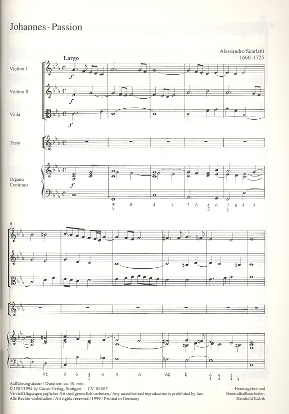 Mit seiner um 1700 entstandene lateinischen Johannes-Passion folgt Scarlatti streng den für die katholische Liturgie seiner Zeit geforderten Notwendigkeiten: Der continuogestützte Evangelienbericht wird durchgehend in einer an Carissimi und Monteverdi erinnernden monodischen Rezitation vorgetragen. Nur bei den Christus-Worten, den knapp gehaltenen vierstimmigen Turbae sowie bei einigen signifikanten Textstellen wie der Judas-Szene und dem Tod Jesu tritt eine dezente Streicherbegleitung hinzu. Ein deutscher Zweittext wurde dem lateinischen Original unterlegt.