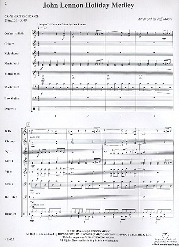 Pop Mallet Ensemble Series Moore, Jeff, arr. Imagine Happy Xmas (War is over) This medley of two of John Lennon's most popular songs has been arranged as a tribute to the holiday season. Although the selected songs' timeless message about peace and goodwill towards men is appropriate all year round, it seems especially poignant during the holidays. The ensemble parts have been arranged to capture the essence of these iconic songs, while providing plenty of teaching and learning opportunities about harmony, melody, rhythm, and feel. This arrangement is an excellent choice any time of year, however, it may just become a staple of your holiday concert repertoire.