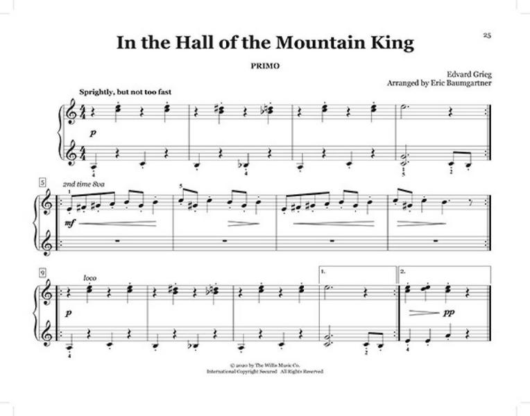 Baumgartner, Eric, arr. John Thompson's Easiest Piano Course Featuring 11 easy arrangements for 1 piano, 4 hands, this book is a fun and engaging introduction to piano duets that perfectly complements Books 2 4 of John Thompsons Easiest Piano Course. Children will love learning classical favourites such as In the Hall of the Mountain King, Ode to Joy, and The Swan, within the rewarding and interactive context of duet playing. First Published in 1954, John Thompsons Easiest Piano Course is one of the most-loved and best-selling piano methods in the world. John Thompsons timeless approach to learning has been trusted by generations of teachers to start millions of students on their musical journey. 1. Barcarolle [Jacques Offenbach] 2. Eine kleine Nachtmusik [Wolfgang Amadeus Mozart] 3. In the Hall of the Mountain King [Edvard Grieg] 4. Minuet in G Major [Christian Petzold] 5. New World Symphony [Antonín Dvorák] 6. Ode to Joy [Ludwig van Beethoven] 7. Piano Concerto No. 1 [Pjotr Iljitsj Tchaikovsky] 8. Rondeau [Jean-Joseph Mouret] 9. Spring [Antonio Vivaldi] 10. The Swan [Camille Saint-Saëns] 11. Symphony No. 5 [Ludwig van Beethoven]