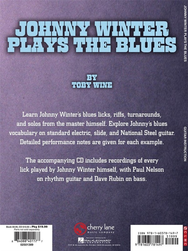 This book/CD package is an insider's guide to the guitar style of Johnny Winter. You'll learn blues licks, riffs, turnarounds, and solos from the master himself, plus slide technique, alternate tunings, and much more. The CD features performances by Johnny Winter on regular, slide, and National Steel guitar, with Paul Nelson on rhythm guitar and Dave Rubin on bass. Detailed performance notes are provided for each example.
