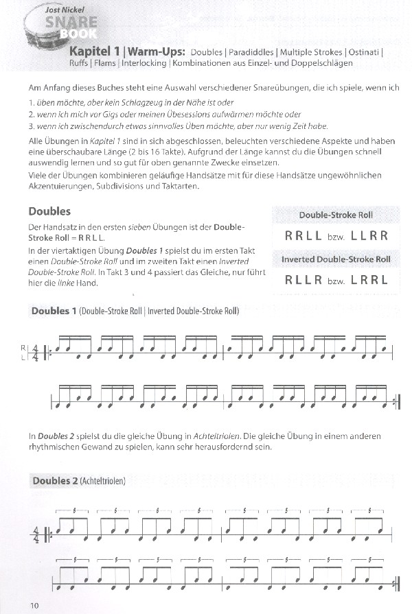 In Jost Nickels neuestem Werk SNARE BOOK dreht sich alles um die kleine Trommel. Auf 124 Seiten bietet er dem Leser eine Fülle verschiedener, variantenreicher Snare-Übungen zur Verbesserung der Spieltechnik und des generellen Rhythmus-Verständnis. «Ich übe gerne, mag aber keine Übungen, bei denen ich ständig das Gleiche spielen soll.» sagt Jost. «Dann schweife ich gedanklich ab und kann mich aufgrund der mangelnden Variation kaum dazu motivieren, weiter zu üben. Natürlich ist Üben Wiederholung, aber ich will mich auch nicht langweilen.» In gewohnt strukturierter Form präsentiert Jost Übungskonzepte in verschiedenen Taktarten und Subdivisions zur systematischen Verbesserung rhythmischer Flexibilität und motorischer Unabhängigkeit sowie besserer Spielkontrolle über Tempowechsel, die den rhythmischen Überblick stärken und dazu beitragen, dass die Übungen in diesem Buch spannend und abwechslungsreich bleiben. «Mein SNARE BOOK ist definitiv KEIN typisches Rudiments-Buch.» fügt Jost hinzu. «Ich bin mir sicher, dass der Variantenreichtum der Übungen in diesem Buch dazu beiträgt, dass du dich gut konzentrieren kannst und so Spaß beim Üben hast. Das macht es leichter, Übungen so oft zu spielen, wie es für das Weiterkommen erforderlich ist.» Gegenstand des ersten Kapitels ist eine Vielzahl verschiedener Warm-Up-Übungen, bei denen beispielsweise bekannte Handsätze mit für diese Handsätze ungewöhnlichen Akzentuierungen, Subdivisions und Taktarten kombiniert werden. Zusätzlich findet man Ostinato-Übungen, die die Unabhängigkeit verbessern und Interlocking-Übungen für eine bessere Koordination. Klare Konzepte prägen den zweiten Teil des Buches, in dem Jost Schritt für Schritt durch Übungen zu Double-Stroke Rolls, Flams, Multiple Strokes, Ruffs, Inverted Double-Stroke Rolls, Paradiddles u.a. führt. Sie versetzen den Nutzer in die Lage, sich seine eigenen Übungen auszudenken, indem er die Herangehensweise beibehält, aber den Inhalt ändert. Jost Nickels SNARE BOOK ist auch ideal zum Üben unterwegs auf dem Drum Pad. Die 12-seitige Beilage mit Lesetexten macht das Paket komplett. Spannend!