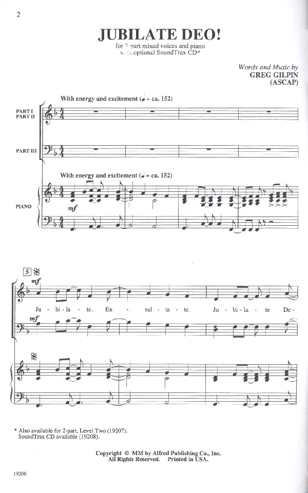 Alfred Choral Designs The energy and excitement of this Greg Gilpin piece are evident in the rhythmic vocal writing and the supportive piano part. The combination of Latin and English text makes it an excellent choice for festivals, contests and adjudications, or for concerts year round. Repetition makes it easy to learn-important for young 2- and 3-part groups. Excellent scoring for the boys in the 3-part edition. A driving SoundTrax CD adds even more vitality.